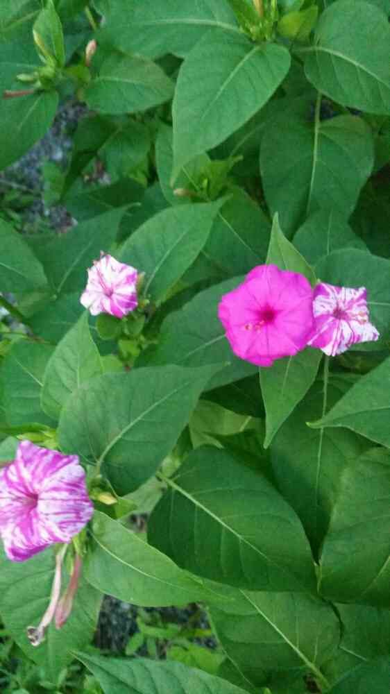 うちのおしろい花。しましま模様と赤と白が同じ茎に咲きます。おもしろくって可愛い