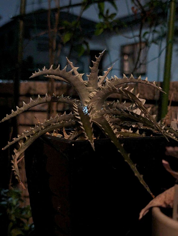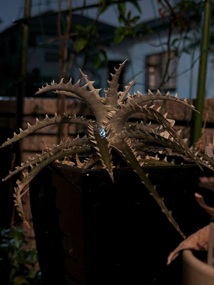 今の玄関先のディッキア、雨粒に街頭(LED)がキラリ✨✨僕の鼻水よりとても綺麗だわ♪