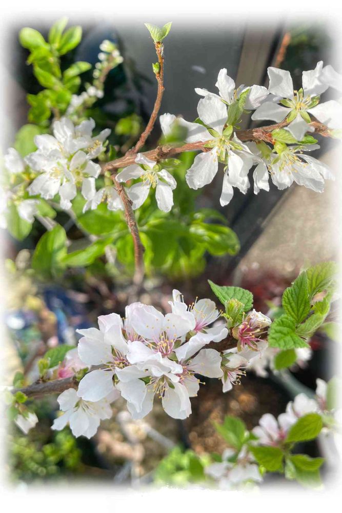 ユスラウメの花が咲きました、上が白実ユスラウメで下が赤実ユスラウメです、実の色同様に花色も違いがあります。