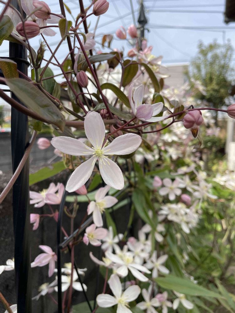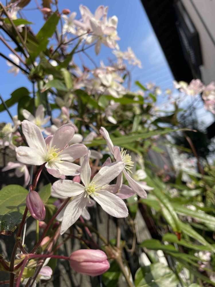 地に植えて2年目のクレマチスアーマンディアップルブロッサム、育ってきました。甘い香り漂います💕