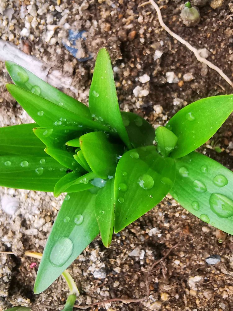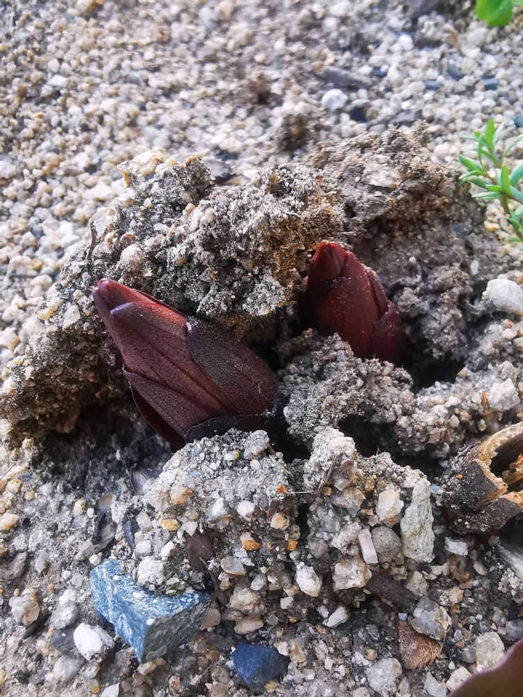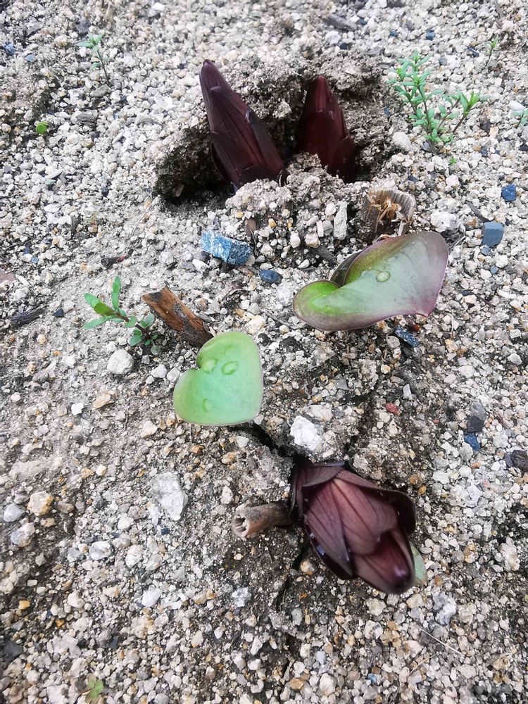 去年の球根に赤ちゃんが数こずつくっついてるから、赤くないのも出てくるよ。別のを植えてなければ、カサブランカの芽🌱だと思う。👀