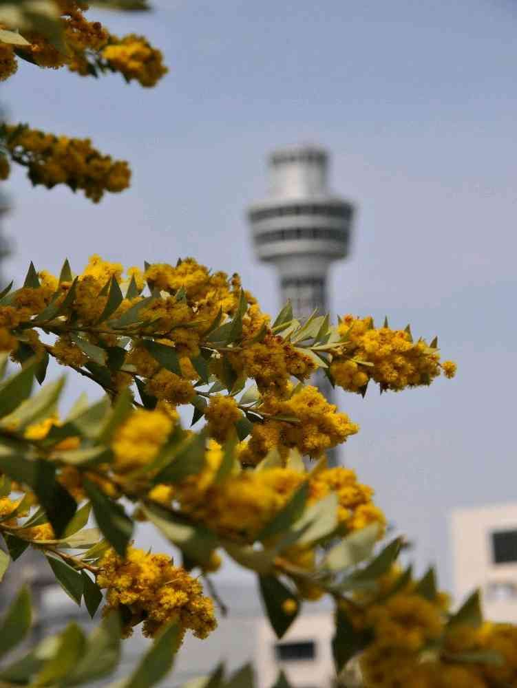 マリンタワーを背景に🗼春の風に揺れるサンカクバアカシア💛