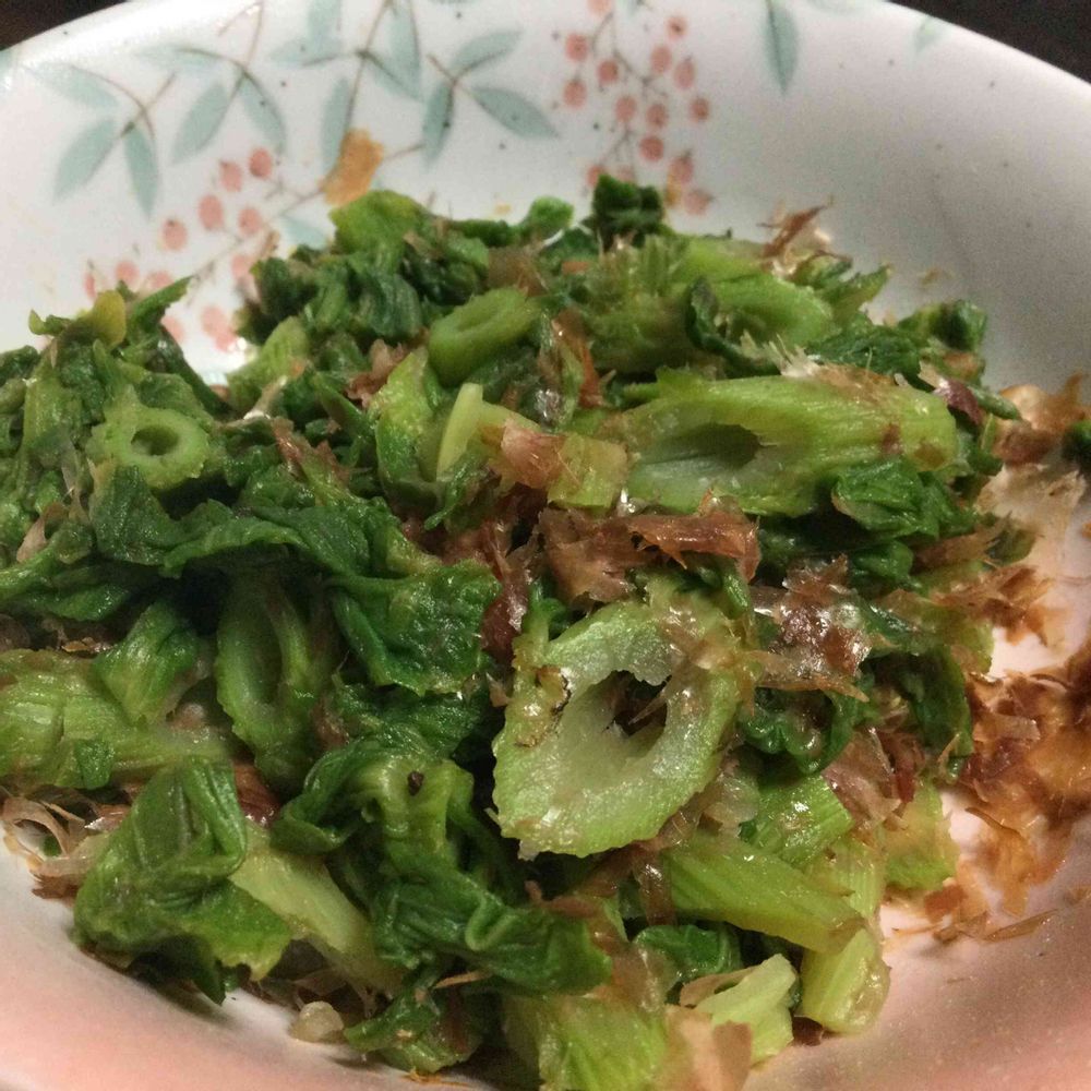 蕗の薹の伸びた茎を塩茹でして、出汁醤油に鰹節をかけていただきました🌱😊‼️