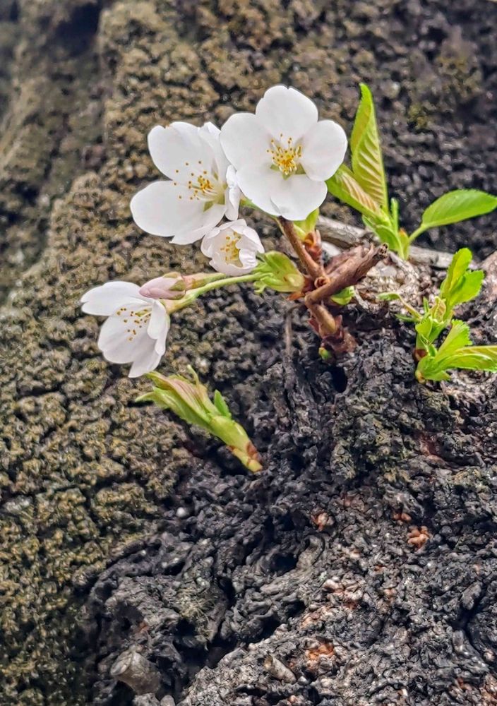 岩みたいな木肌から花芽を出して咲かせるんだね。