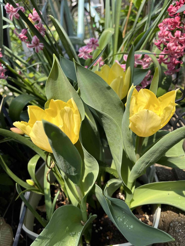 綺麗なチューリップ。あの奥の花、ヒヤシンス?立派と思って、読んでたら、ヒヤシンス、しっかり、花がついてますね。