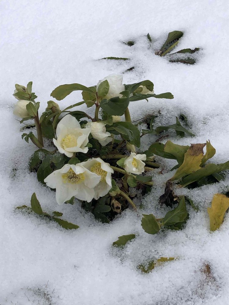 雪の中からこんにちはのクリスマスローズさん、はじめて見ます。