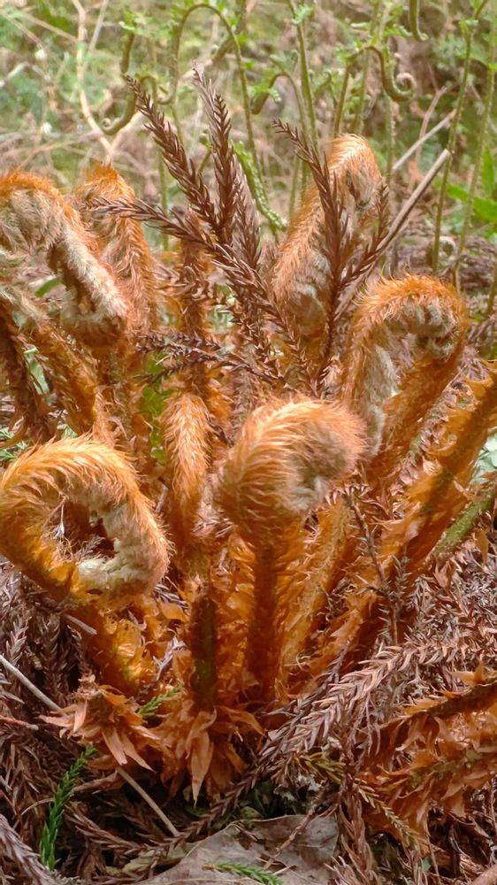 シダの展開前の若芽は先端部分を内側にして巻かれた状態になっていて、それをワラビ巻きとかフィドルヘッドとか呼ぶそうな🟤 そういえばバイオリン(フィドル)の頭の部分に形が似ている(2枚目) 木曜モフモフ🏷️