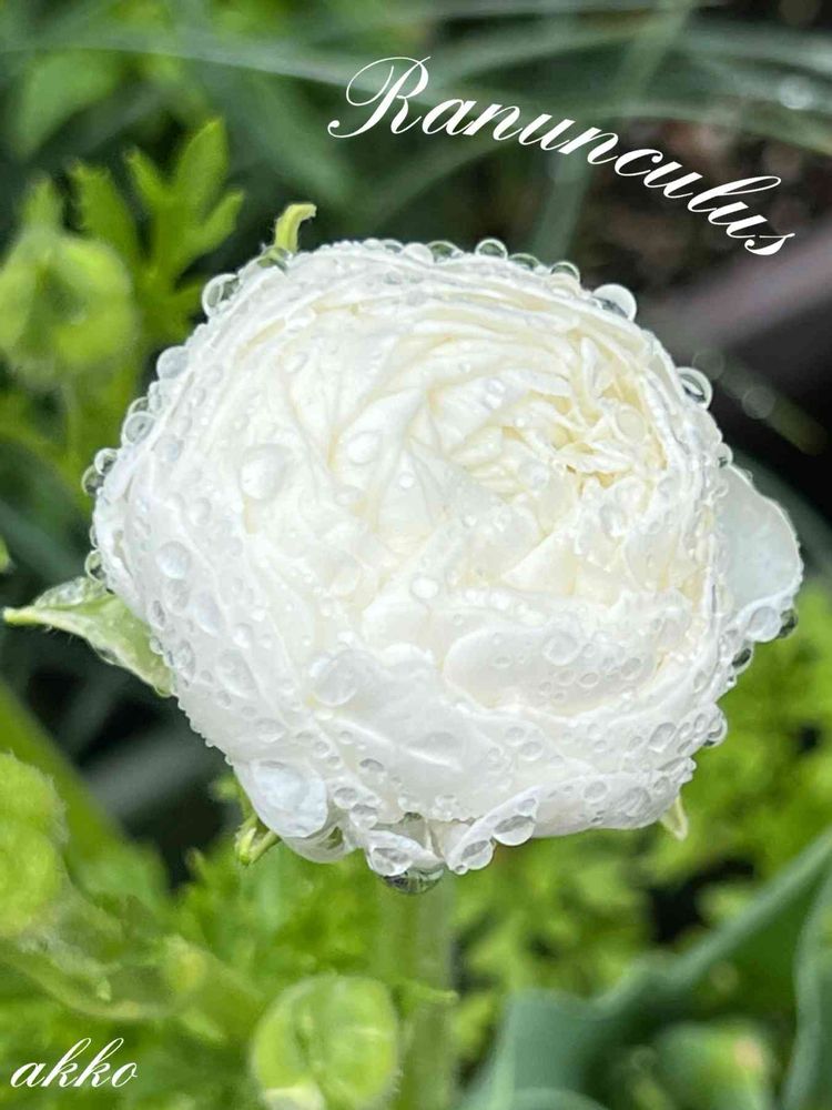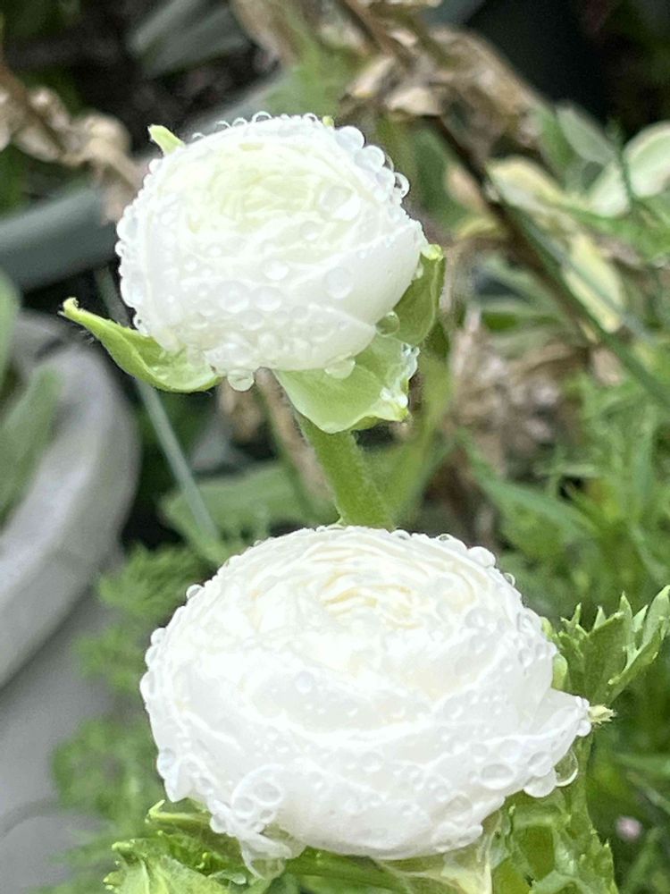 雨粒っていい仕事してる〜〜純白のラナンキュラスを一段と引き立てているわ〜🥰🤩🥳👍👍👍👍👍