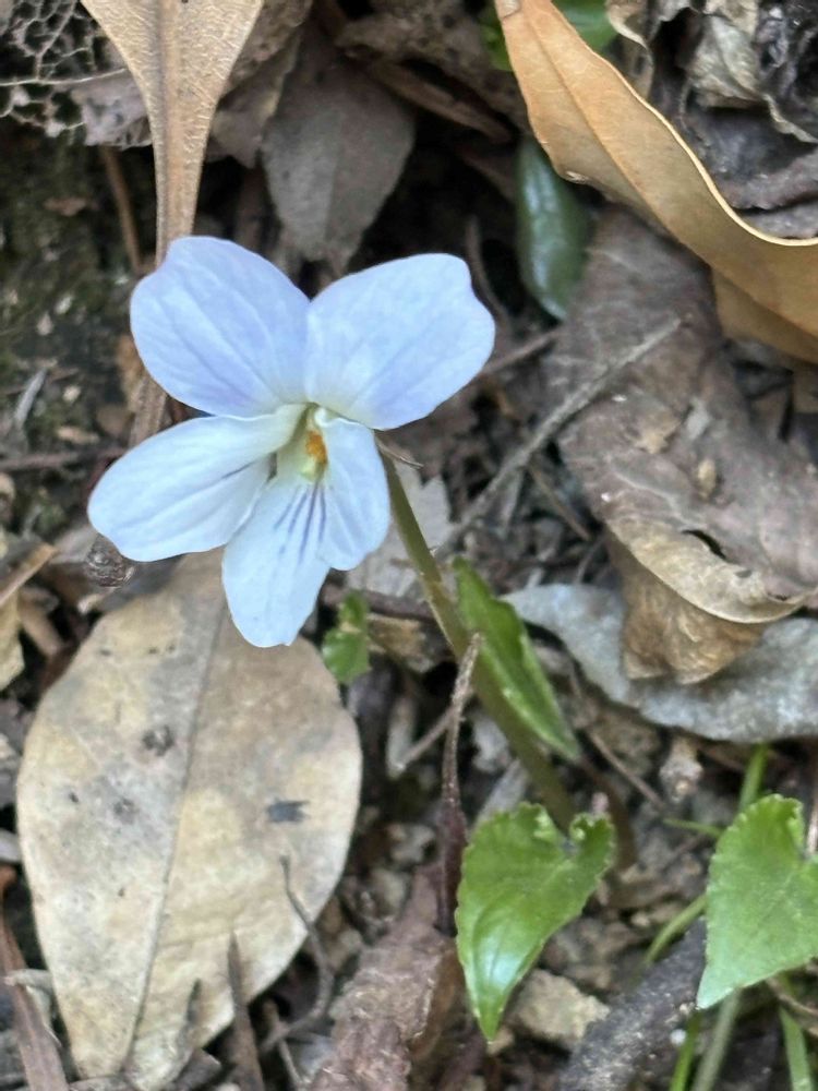 ④葉っぱが違う。何だ?と違う角度でよく見たら⑤他のスミレ(多分タチツボスミレ)のそばに咲いてただけです。葉裏が少し見えて紫色を帯びています。