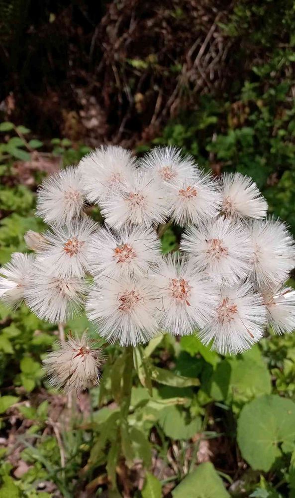 キク科フキ属の多年草。山野の日当たりのよいところに生え、地下茎を伸ばして殖える。葉は腎円形で基部は深い心形。はじめ両面とも毛があるが、後には無毛。葉柄は長さ60㎝、直径1㎝ほどになる。花期は3~5月。葉が出る前に花茎を伸ばし、散房状に頭花をつける。雌雄異株。雄株のフキノトウは筒状花の花冠と葯が目立って黄白色に見える。星形をした雄花は、その筒部に多量の蜜をためて虫を呼ぶが、花後は枯れる。雌株のフキノトウは白い雌しべが糸状に伸びて純白に見え、成長すると結実する。雌花には花粉も蜜もないため、虫を呼ぶために雌花の中に少量のダミー雄花を紛れ込ませて蜜を出す。ダミー雄花は性的には機能せず、蜜を出し虫を呼びこむためだけのもの。花後に花茎が40~70㎝ほどに伸び上がり、白い冠毛が目立つ果実期になる。痩果は細い円柱形で果皮に毛はない。冠毛は純白色。