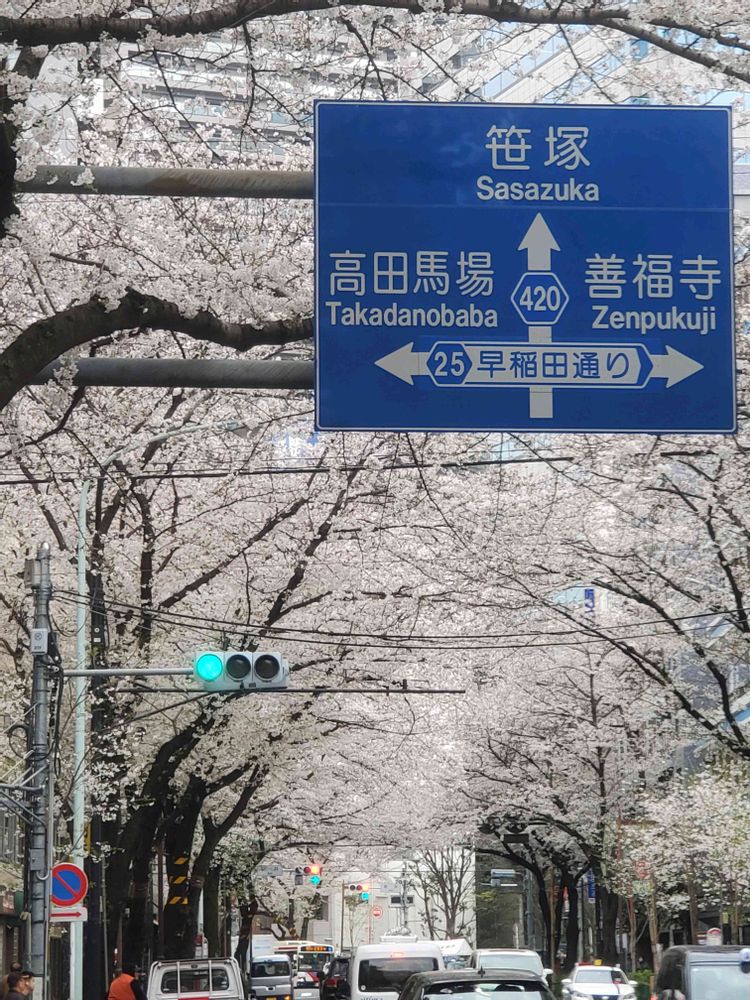 道路標識の青🟦と信号機🚥のライトが桜の海に映えていますね。