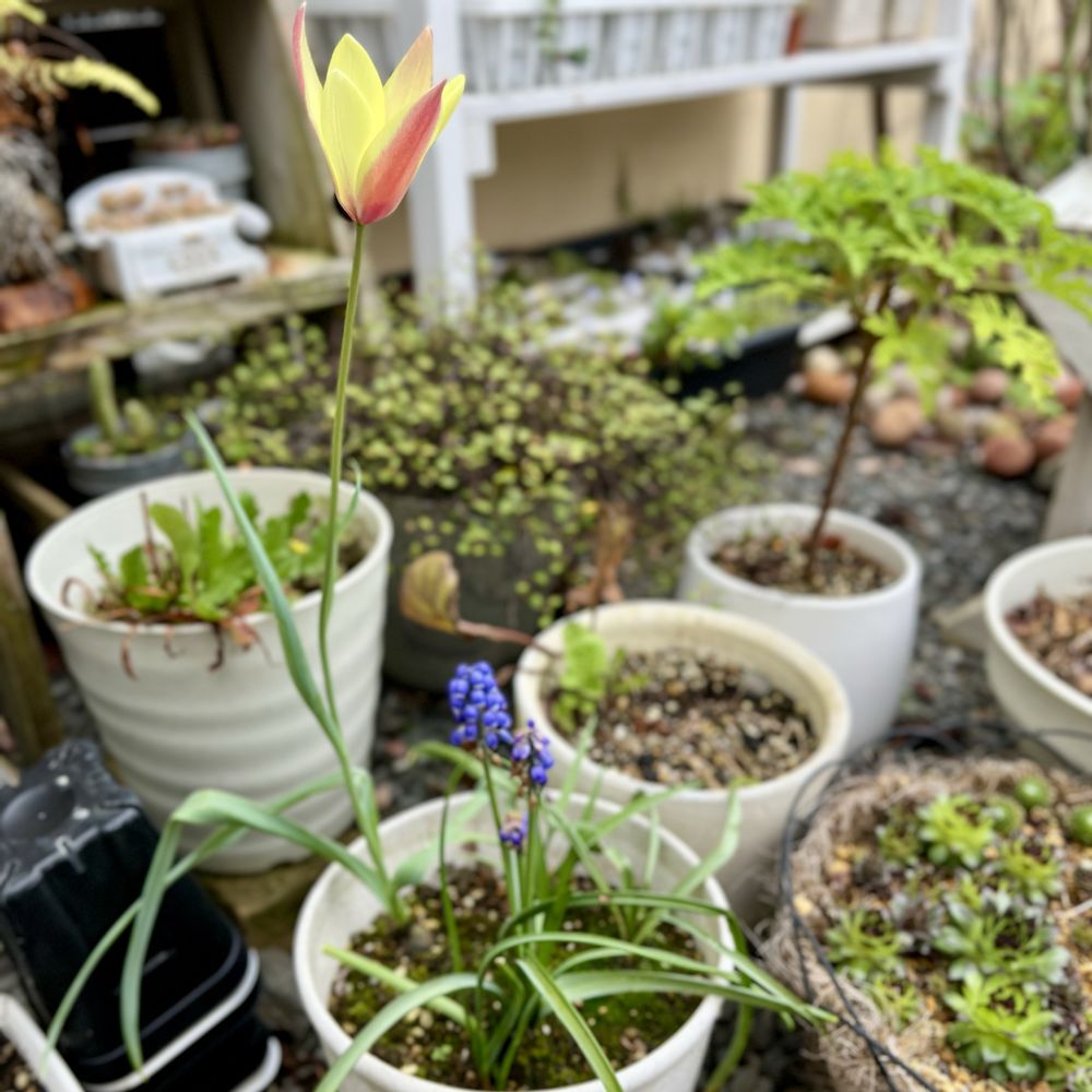 去年の早春、水耕栽培で楽しんだ球根たちを花後に土に植えておいたら、今年ムスカリとチューリップが開花してくれました。