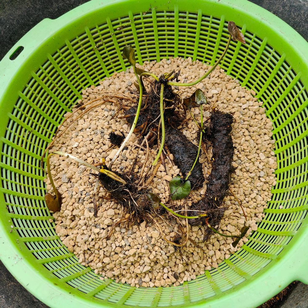 水蓮はひとつ移したが葦に飲み込まれた植木鉢入りの 細い紐の様なのはウィローモスの様です40年も前に熱帯魚の水槽から?根が折れたりしたがどうせ鉢の外に根が出るならとザルに植えて日向土に植えて水蓮の横に移動新たな一歩鹿沼土に植えると浮いてしまって失敗するからね〜残った葦はメダカの鉢に入れようか