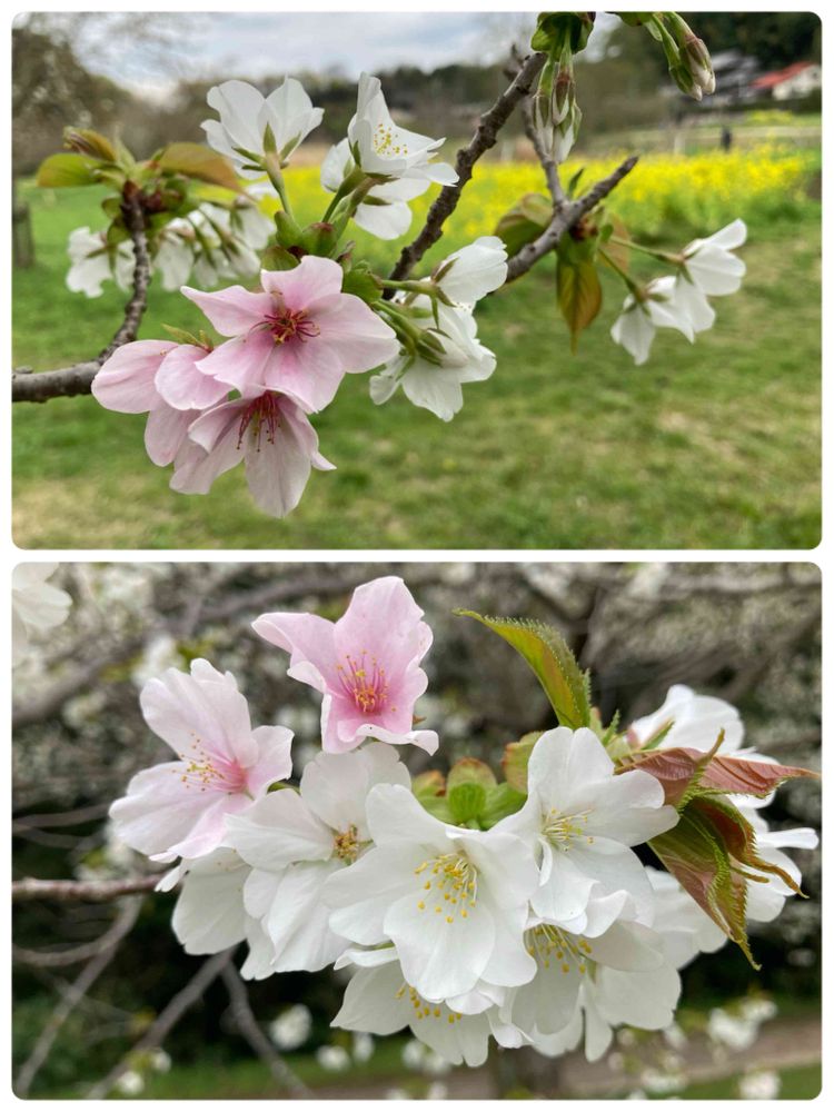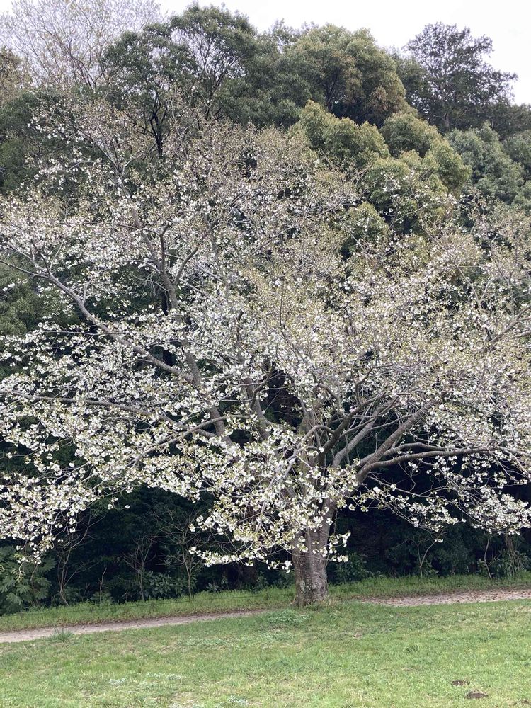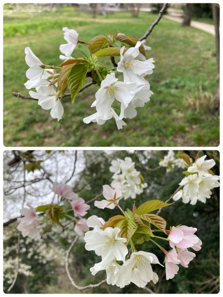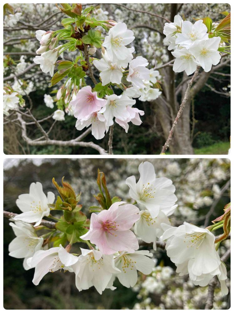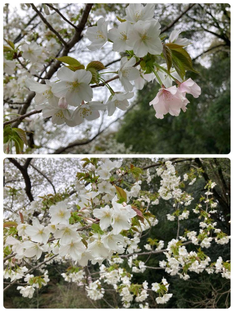 何桜かわからないけど、白い花の所々にピンク色の花が混じっている。 隣に「大島桜」が咲いていたので、同じ桜かなぁ…って思って花をよく観たら微妙に違っていた。