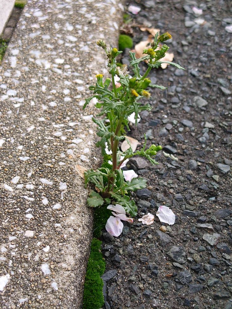 駐車場の角にボロギクかな?健気に咲いています周りには桜の花びらがチラホラ満開の桜並木のそばです、お名前教えてもらいましたノボロギクでした