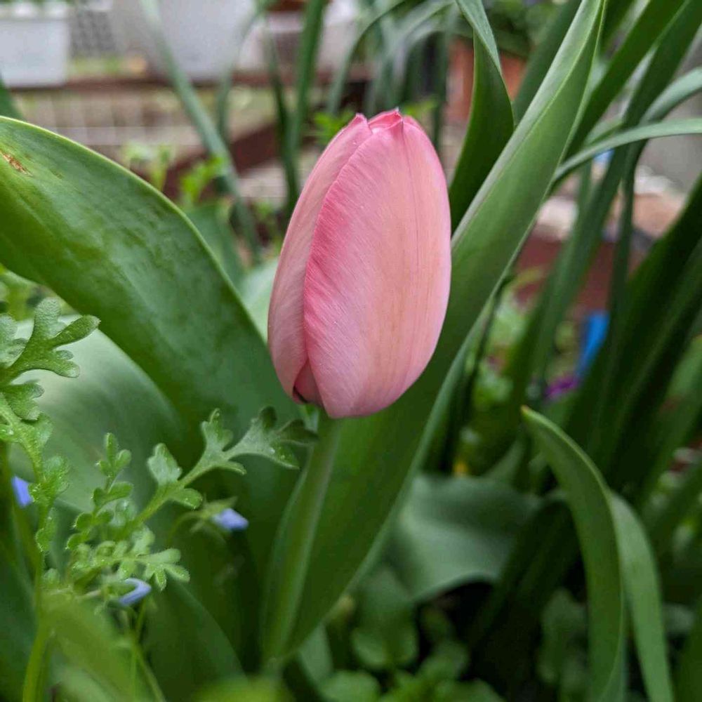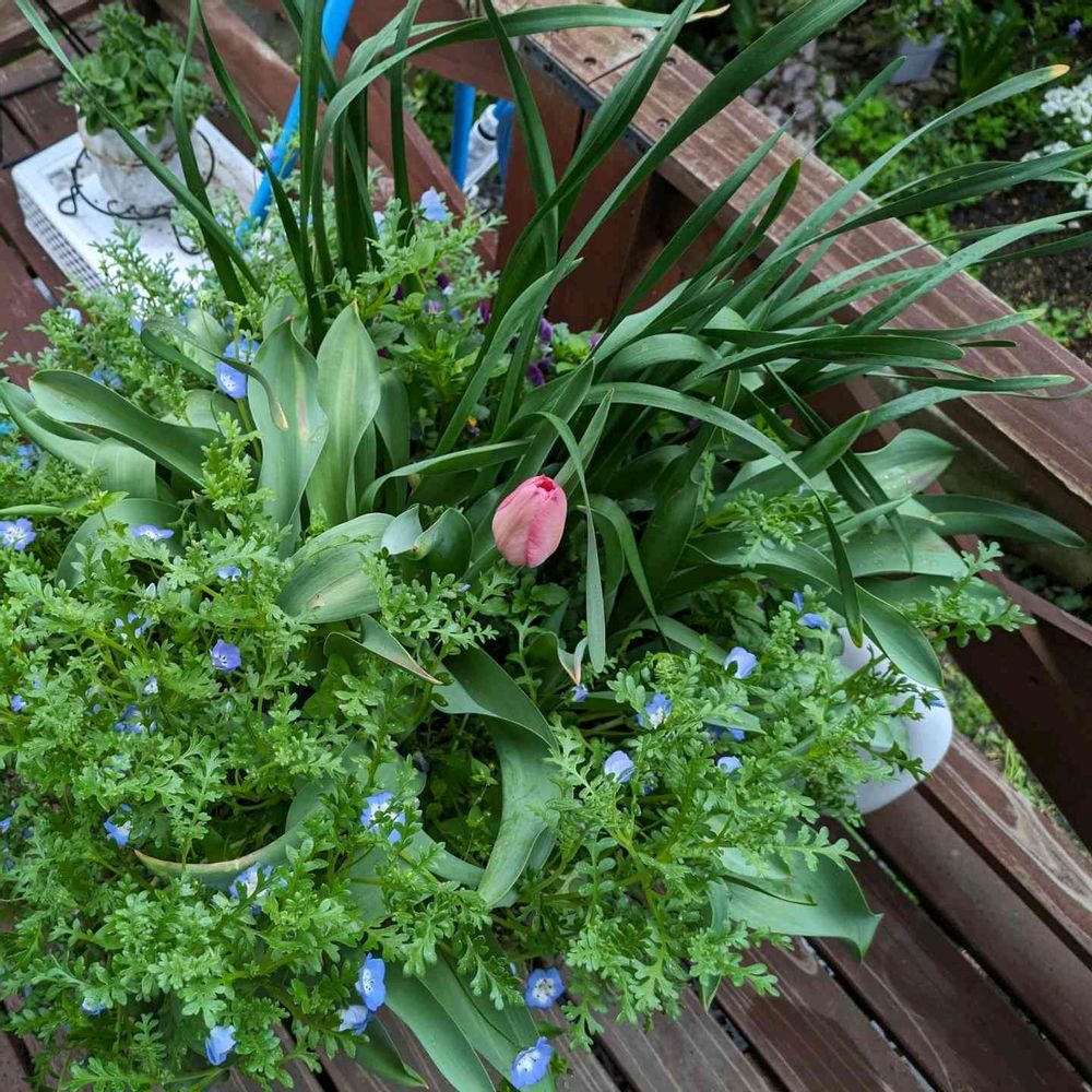 我が家のチューリップ1号。大きい鉢だからって水仙ネモフィラビオラと欲張りすぎました。
