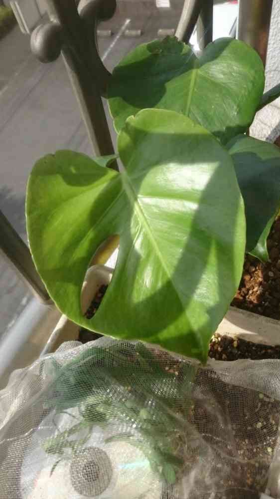 モンステラ という植物で、小さいときは穴がないポトスのような葉っぱで、大きくなると穴があいたり、切れ込みが入って姿を変えるんですよー・:*+.\(( °ω° ))/.:+