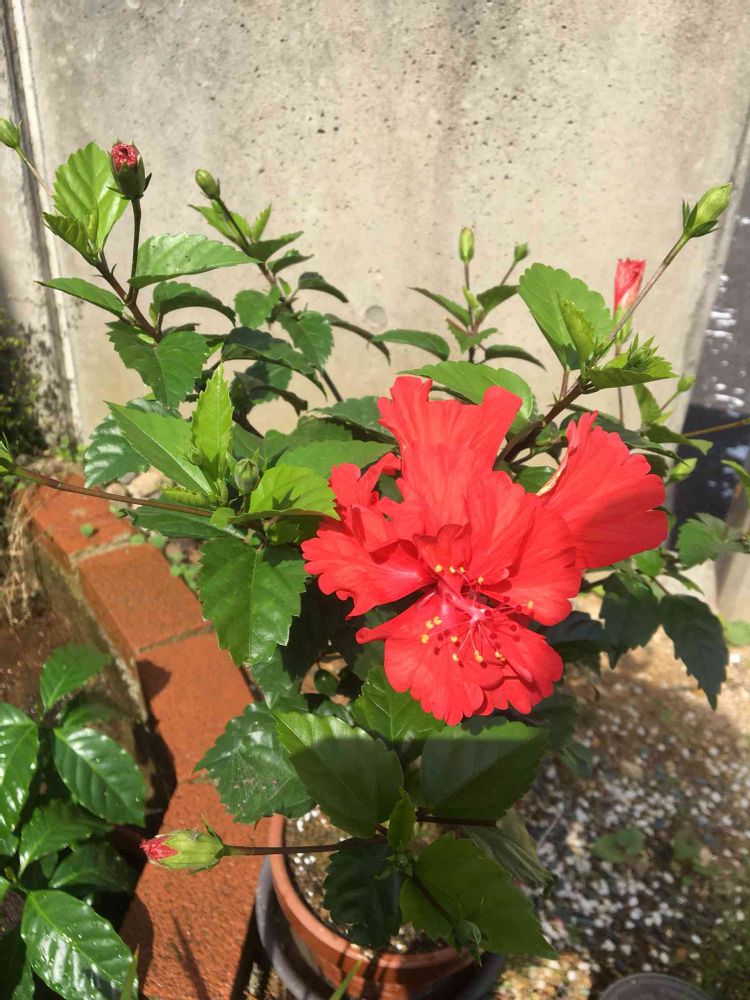 暑さに負けずに今日のお花の情熱的な赤いハイビスカス🌺の花が咲いてます。
