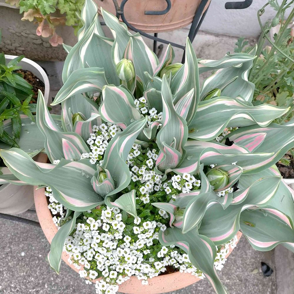 ハッピーアップスターのピンクの斑がかわいい💘 アリッサムもちょうど良く広がって、スイートな一鉢になりそうですね~