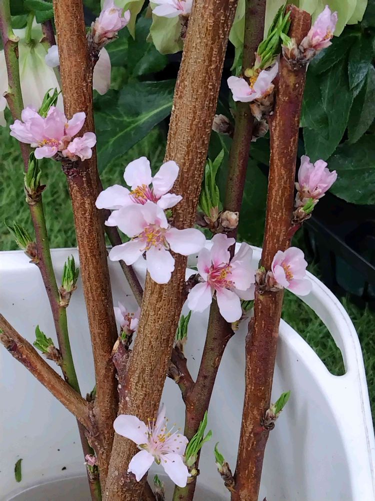 ②クリスマスローズと膨らみ始めた花桃の蕾💜💗🩷