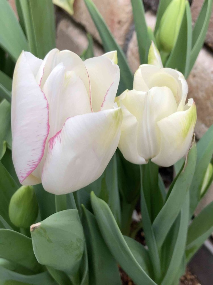 白いチューリップが咲きました🌷ピンクの縁取りや薄らとグリーンが入ったお花は同じ品種なのか?違う品