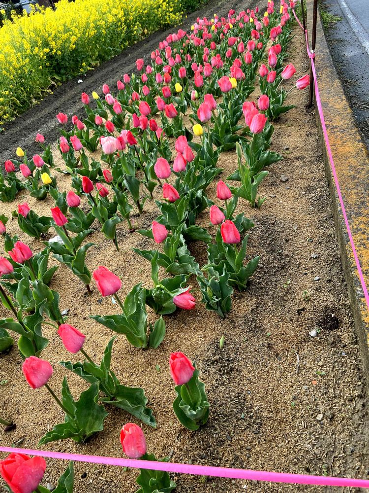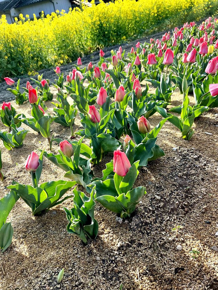 菜の花の黄色と赤いチューリップで、見ているだけで、ウキウキしますね🥰🥰🥰