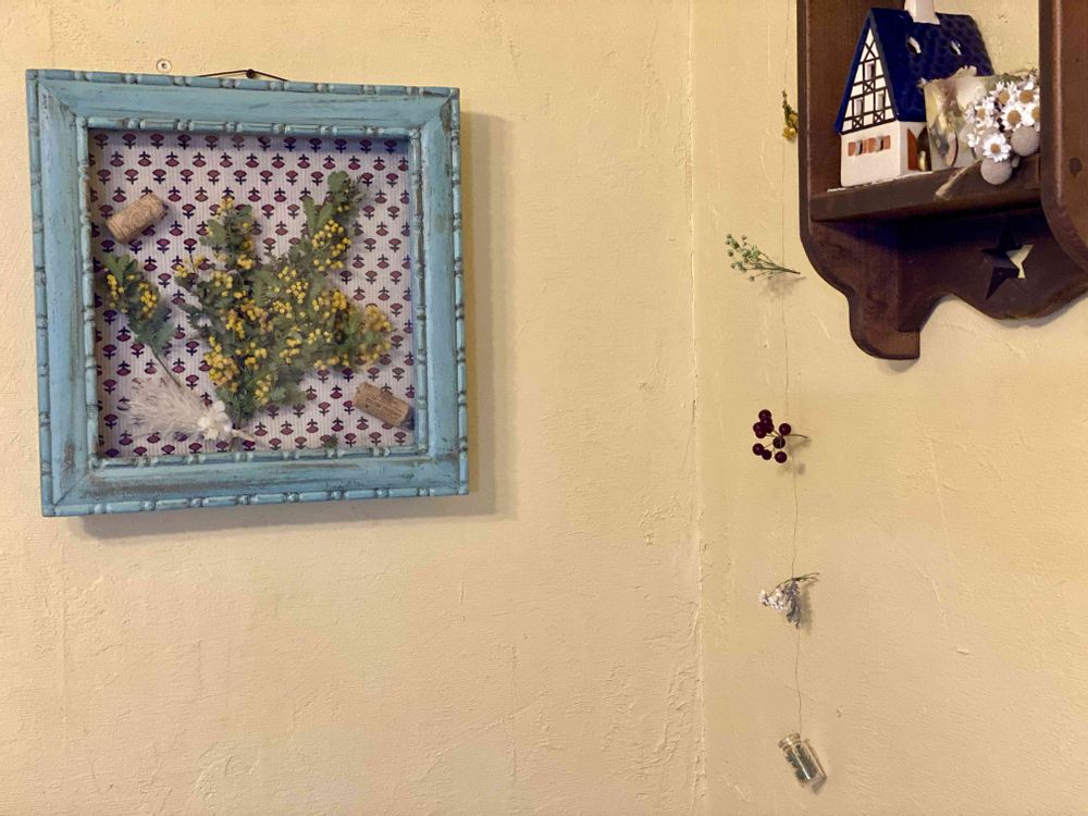 我が家で初めて咲いたミモザ🟡(先っちょだけしか咲かなかった😅)を額縁🖼️に入れてみました。