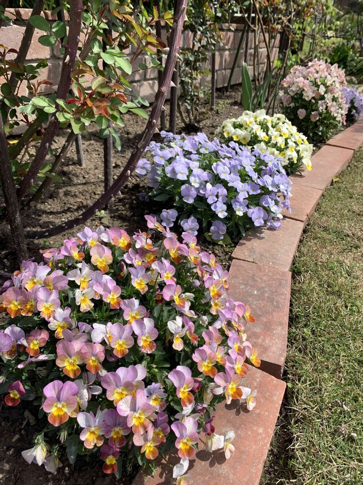 薔薇の緑や赤い新芽も可愛いし、こんもりしたビオラもかわいくて、ニヤニヤです