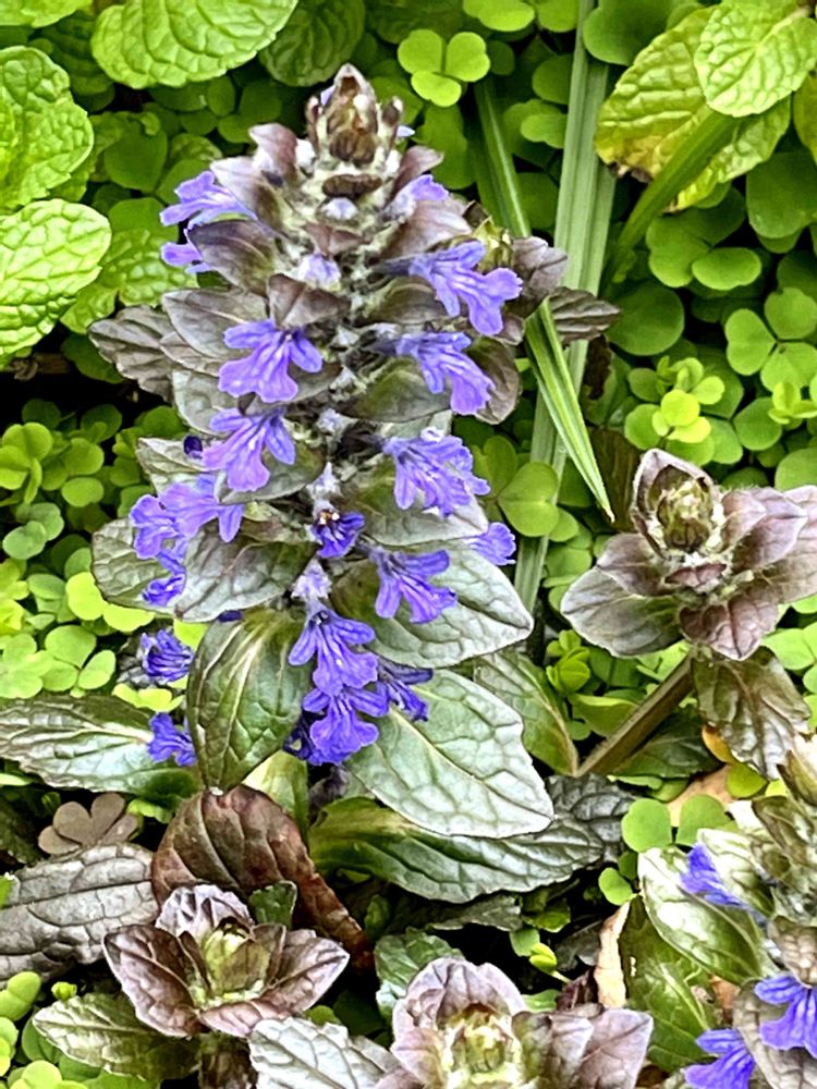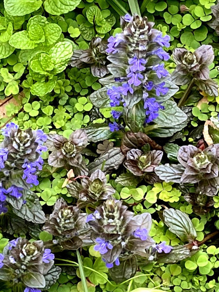 花壇のアジュガが、ミントやオキザリスに場所を取られて隠れてました。