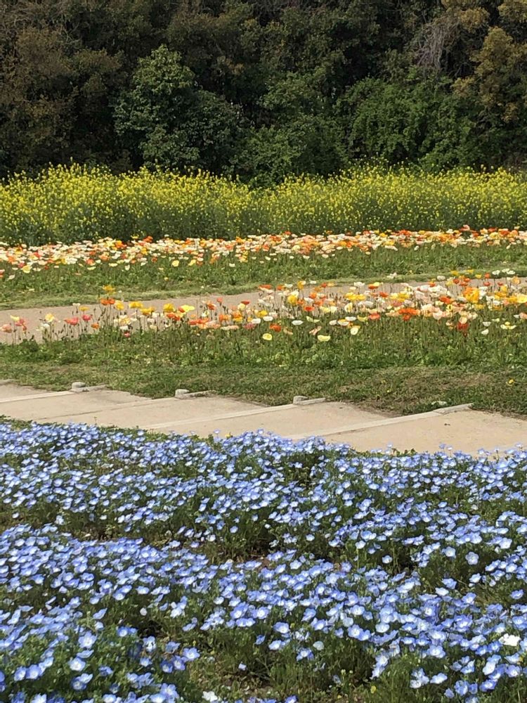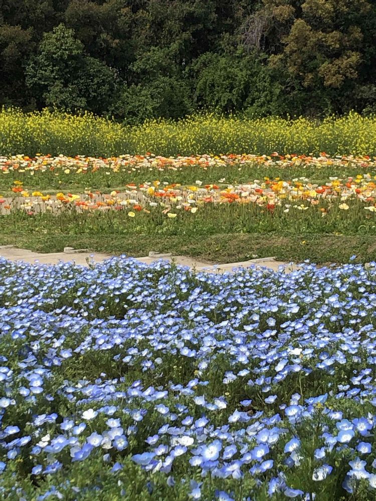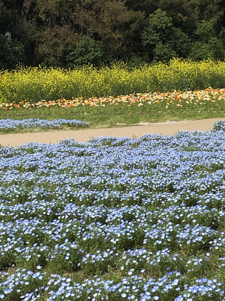 万博公園の「花の丘」にて、ネモフィラ💙、ヒナゲシ🧡、ナノハナ💛をパチリ!📸😄🤗🌞✌️