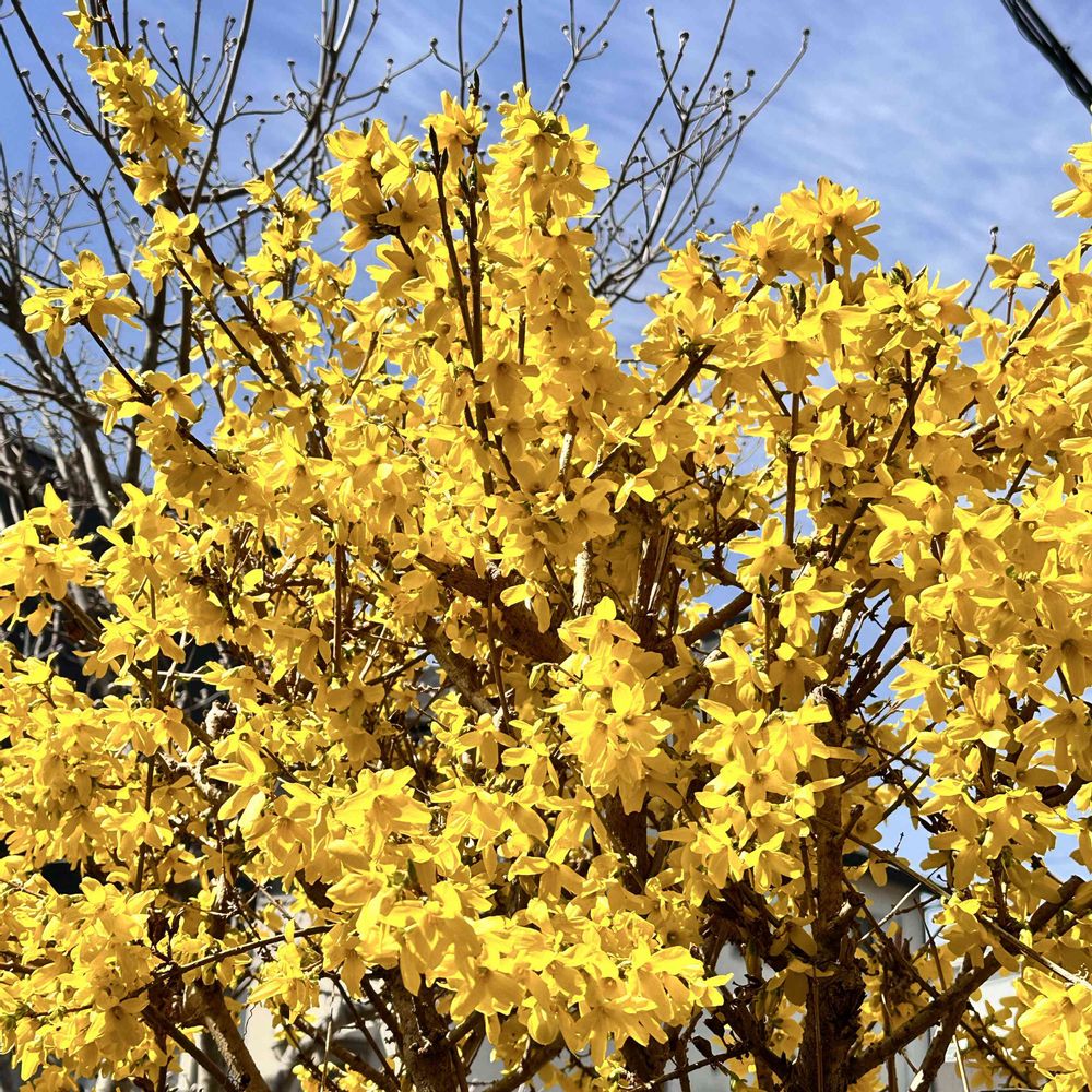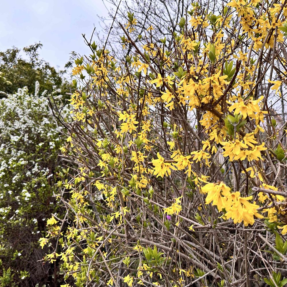 ↘️我が家のレンギョウと↗️お隣の栄養満点花付きの良いレンギョウ