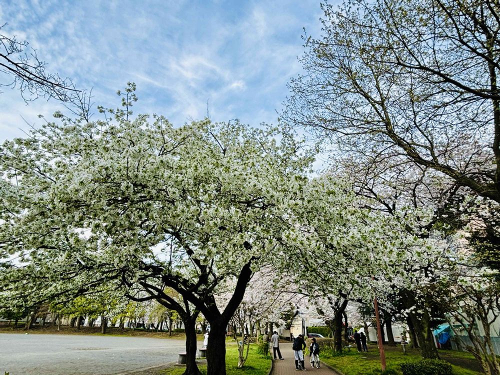 東柏ケ谷近隣公園のソメイヨシノの大木の中に、ちょっと低めの白い花びらの桜の木が一本🤍🍃