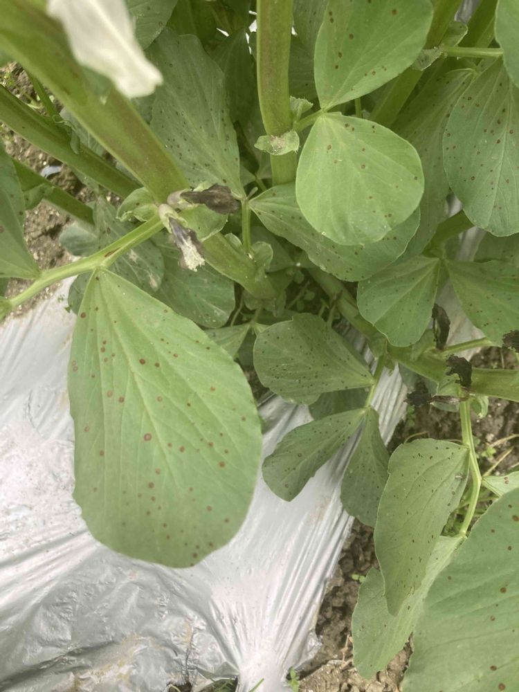 そら豆も順調に成長していますが、一部の葉に病変らしきところがあります。赤色斑点病かな?
