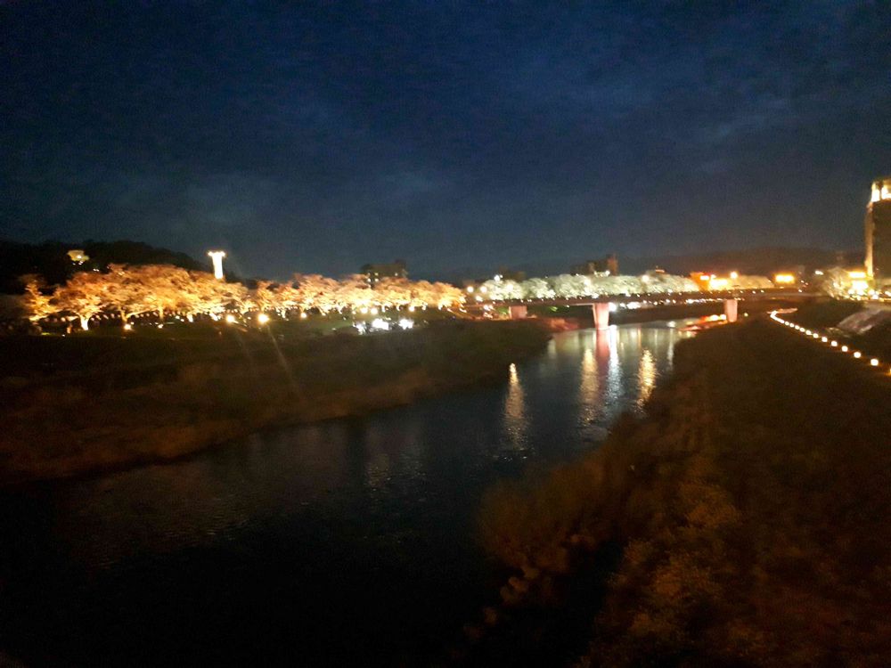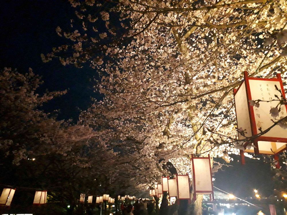 桜の開花時期に合わせて、足羽川の桜並木(日本最大級)に、地元小・中学生が詠んだ独楽吟をあしらった手作りのぼんぼりを吊り下げています。ぼんぼりは、夜になるとライトが点灯し桜を彩る春の風物詩となっています。