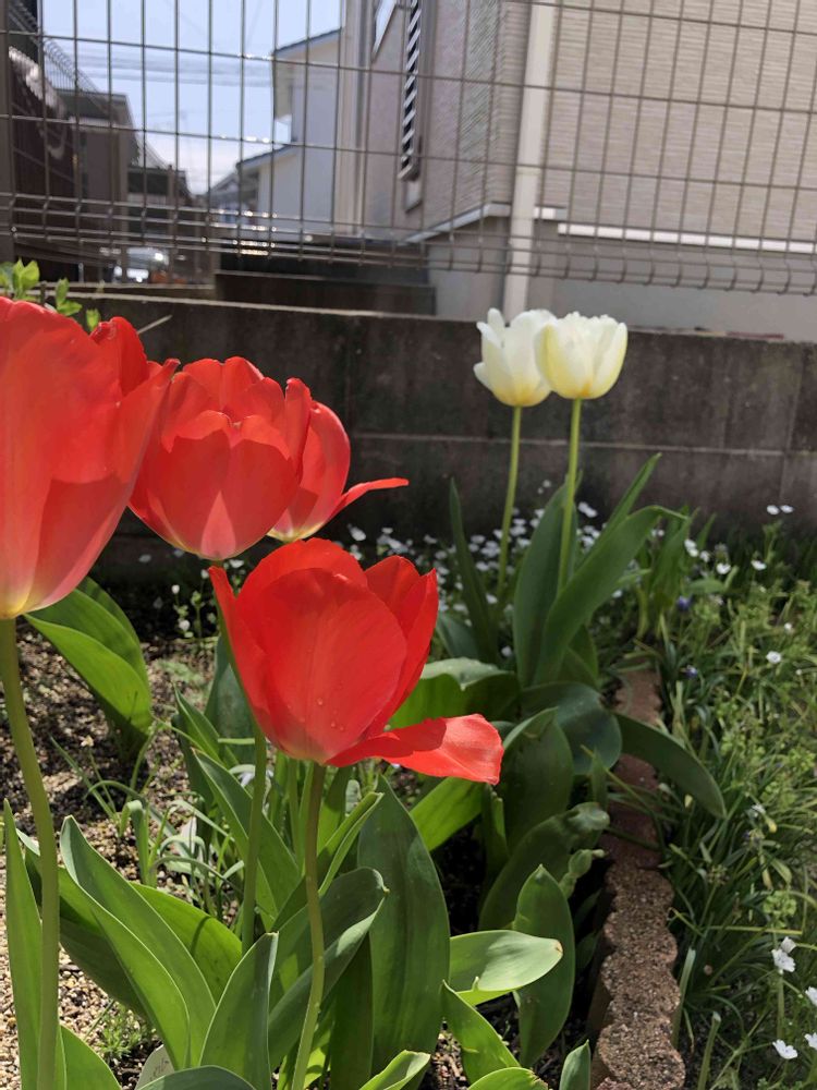 白色のチューリップも咲きまさした。花壇のネモフィラも咲いてきました。