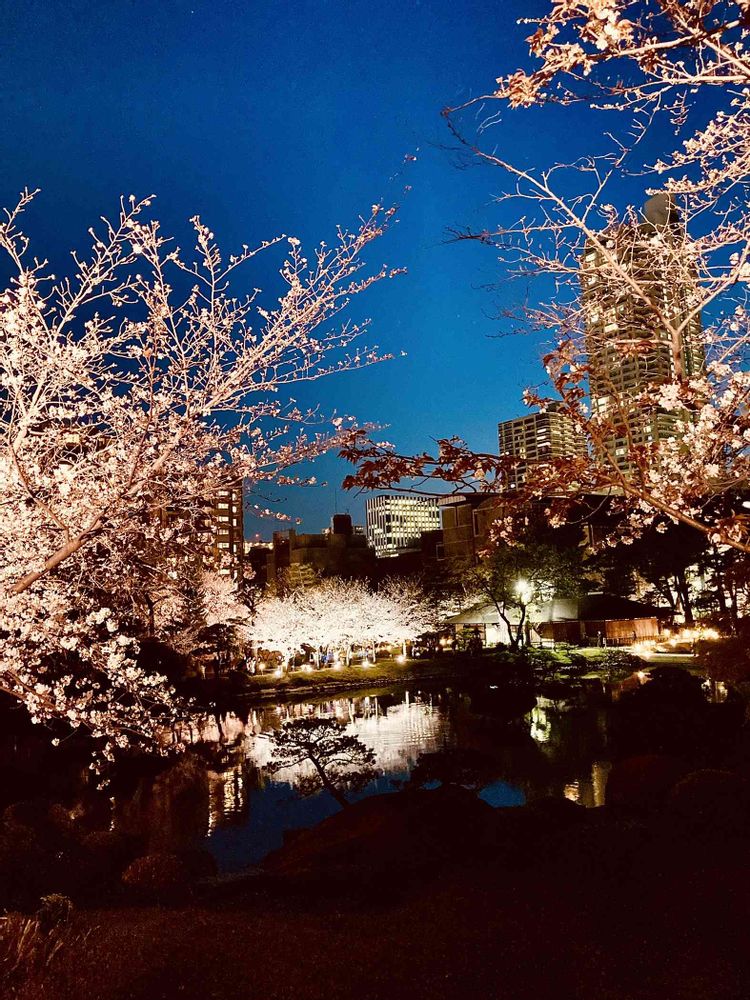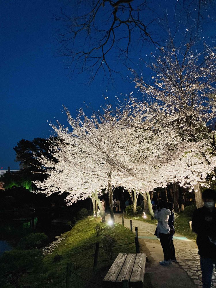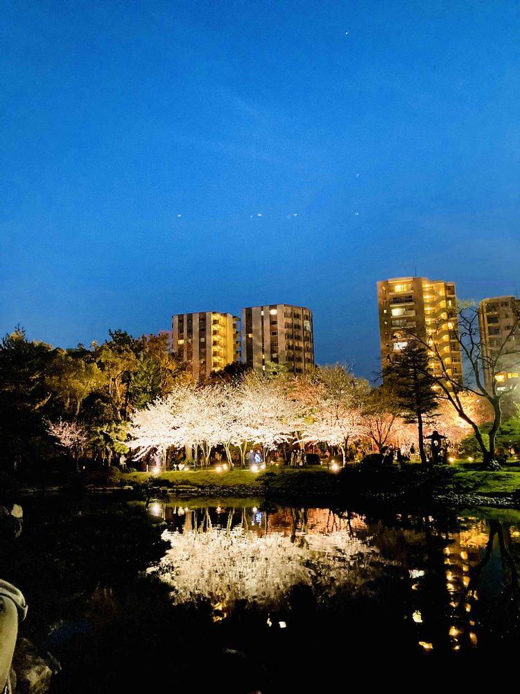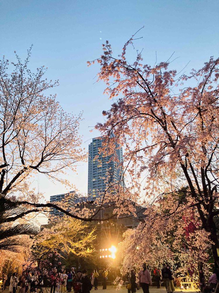 日が暮れる時間と重なり、夕焼けに照らされる桜も風情がありました。