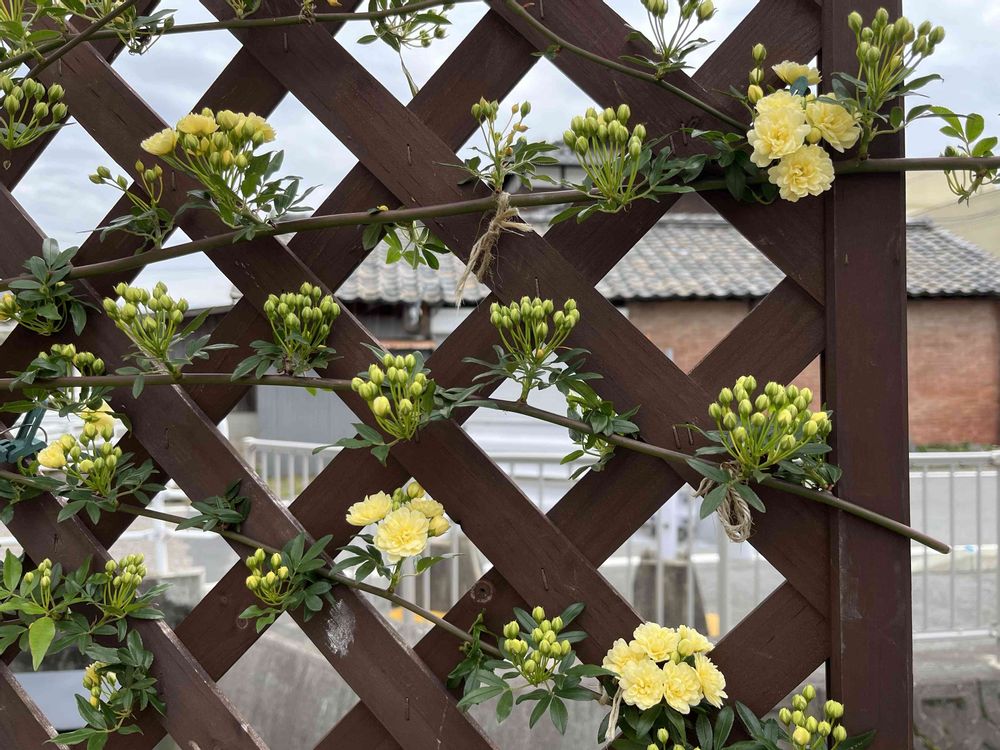 今までは低いフェンスに束ねて誘引してたから咲いた時の豪華さはあったけど、ラティスを立てて、枝を減らして横に誘引。