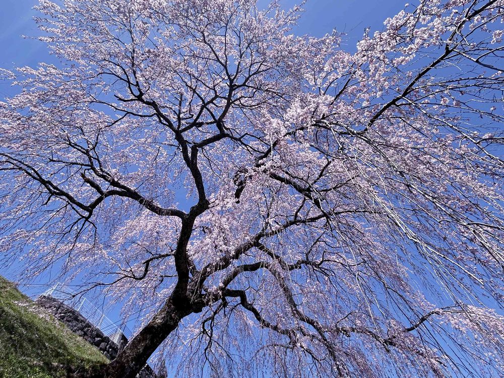 18の桜の名所の中の『岩太郎のしだれ桜』この桜を植えた人の名をとって、名付けられた「岩太郎のしだれ桜」。樹齢は約120年で、高さ約20メートル、幹回り2.6メートルの巨木です。土手の中腹に立ち、道行く人に覆いかぶさるように堂々と咲き誇る姿は圧巻です。真下から眺めると、まるで桜のシャワーを浴びているようです🌸