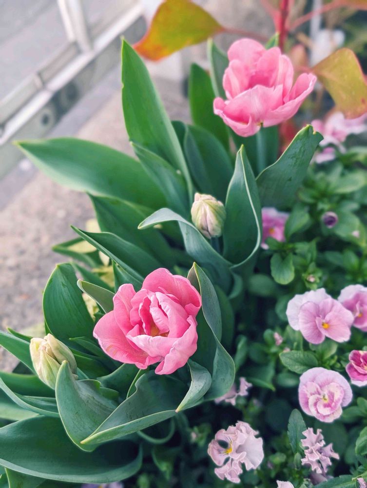 3枚目はパンジーとチューリップのダブルデッカー植え。もうすぐ、チューリップ🌹ハウステンボスも咲いたら、✨きれいかな〜。