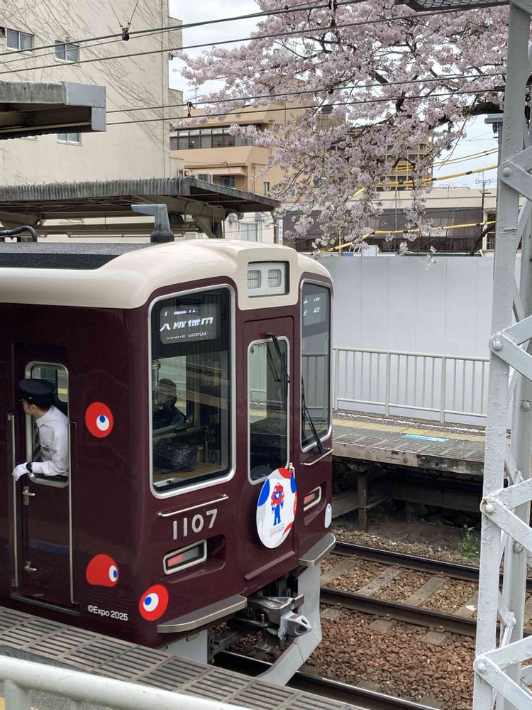 大阪万博のラッピング電車と桜🌸