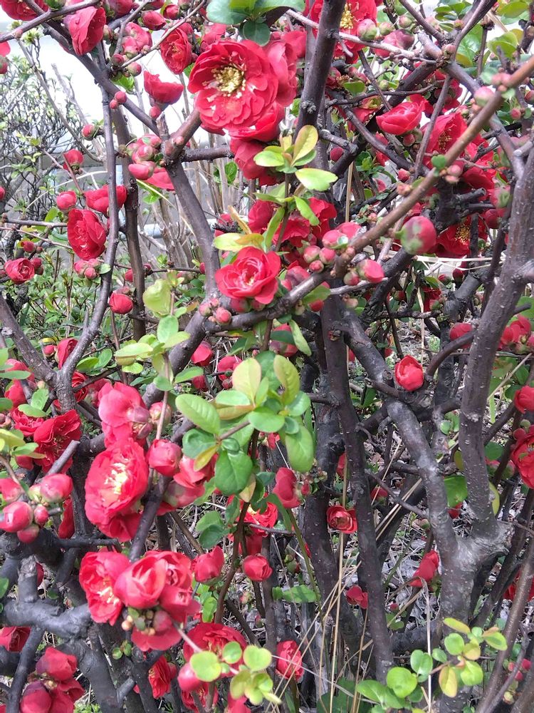 木瓜の花 沢山 咲いてますね❗本当に真っ赤❗