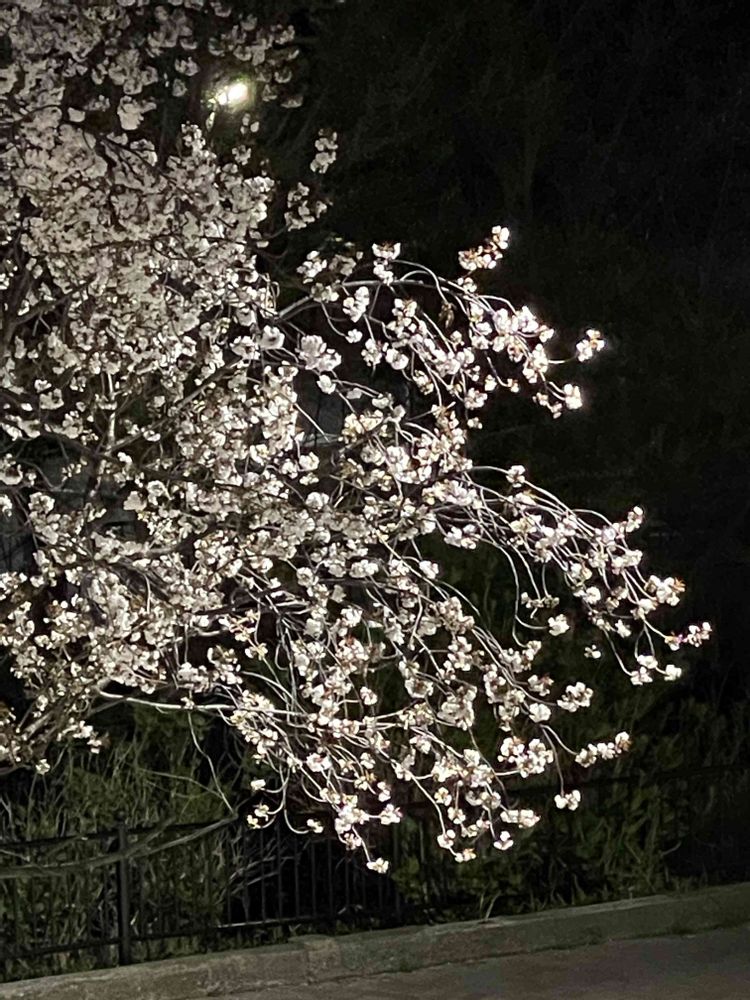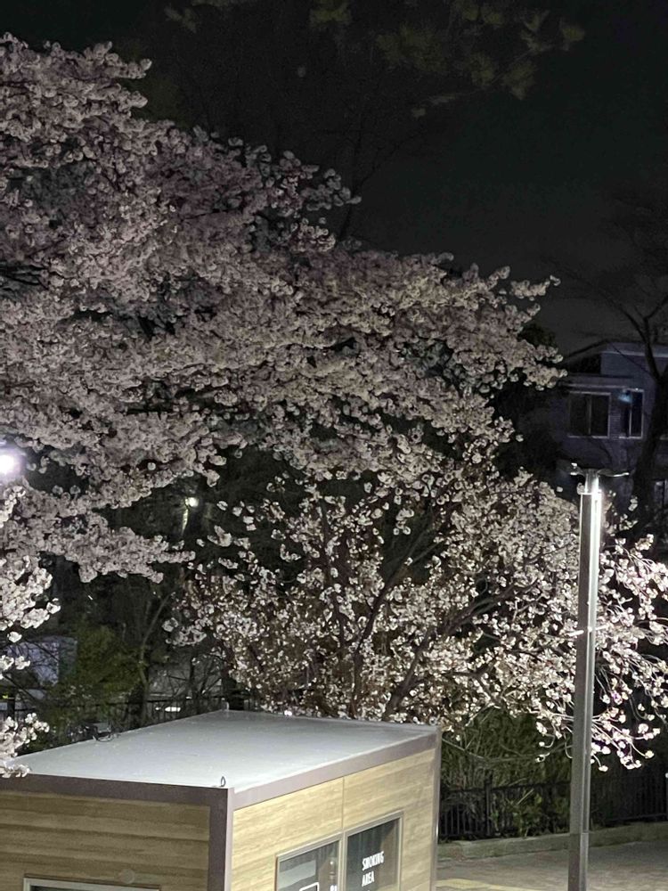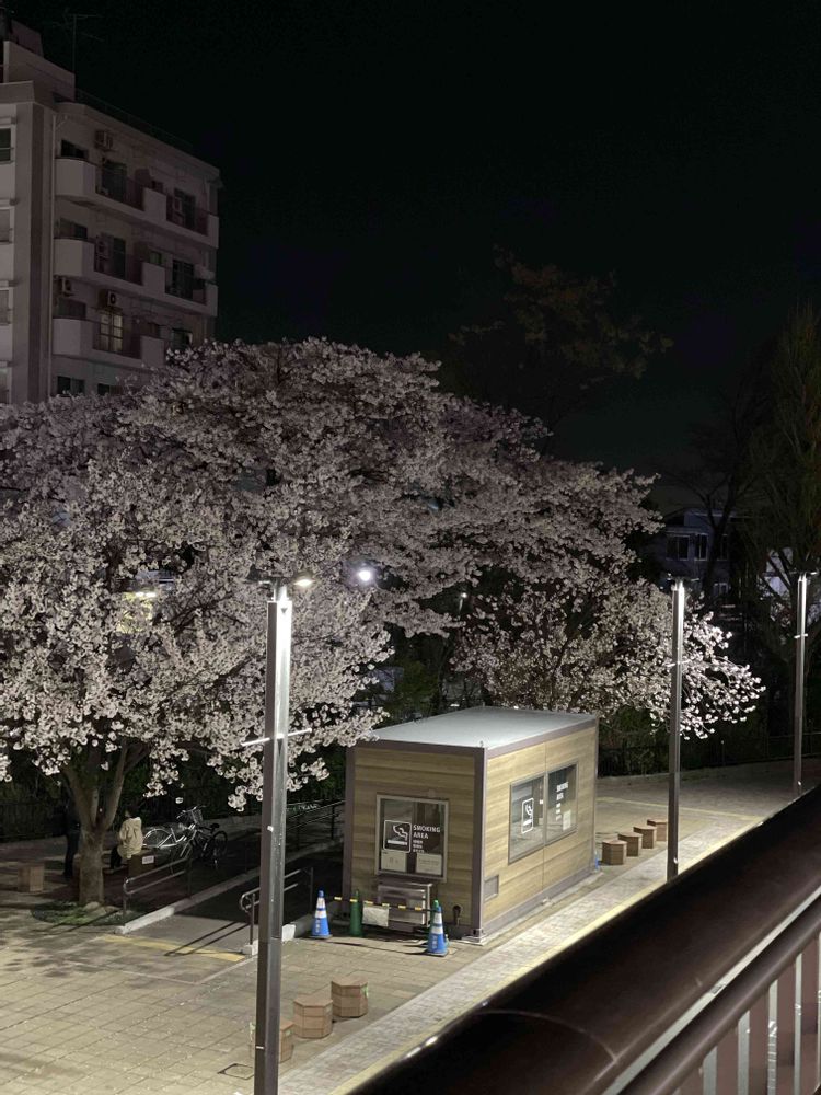三枚目までは夜桜、ジブリ美術館行きバス停前🚌