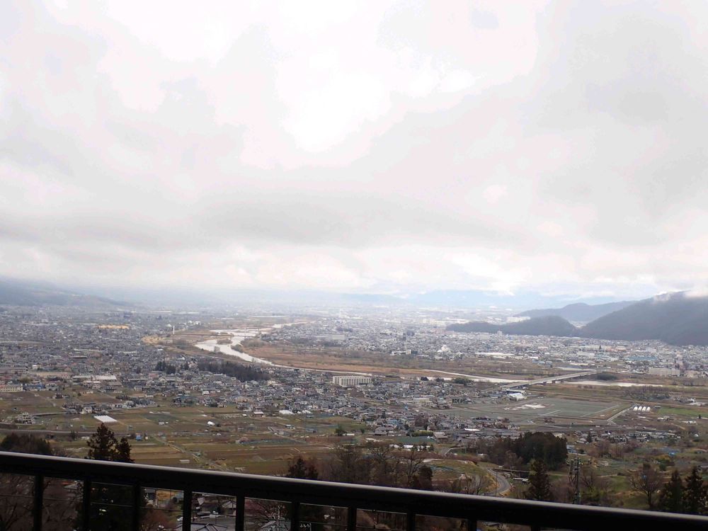 千曲市にあるJR篠ノ井線、姨捨駅上り線用のホームから見る姨捨の棚田と千曲川、善光寺平の絶景です。遠くに北信地方では信濃富士と呼ばれている飯綱山と戸隠、黒姫の山々が、また正面には鏡台山、五里ヶ峰、そのホームからは見えませんが、右後方にはシンボルの冠着山、真ん中を雄大に流れる千曲川…