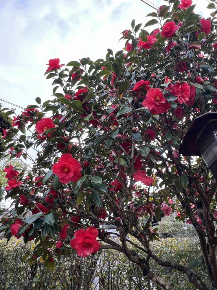 お庭は椿の絨毯、芝生や低い木の上にも素敵ね