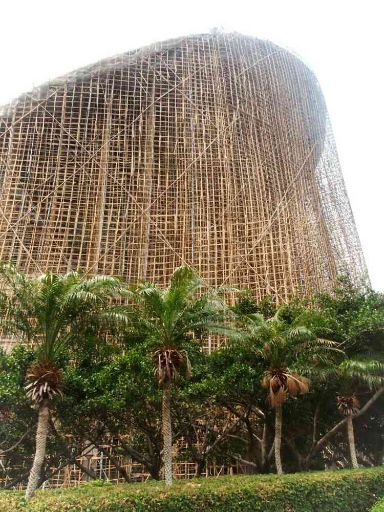 ココヤシかな?の奥にそびえ立つ香港伝統驚愕の手仕事、竹足場、芸術の域に。