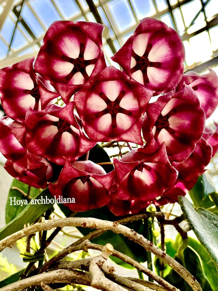 なんと、ホヤ・カルノーサ、東山植物園で、ビンゴです!ピンク・白・赤、どれも美しいです🩷🤍❤😍白もあったんですね〜😅