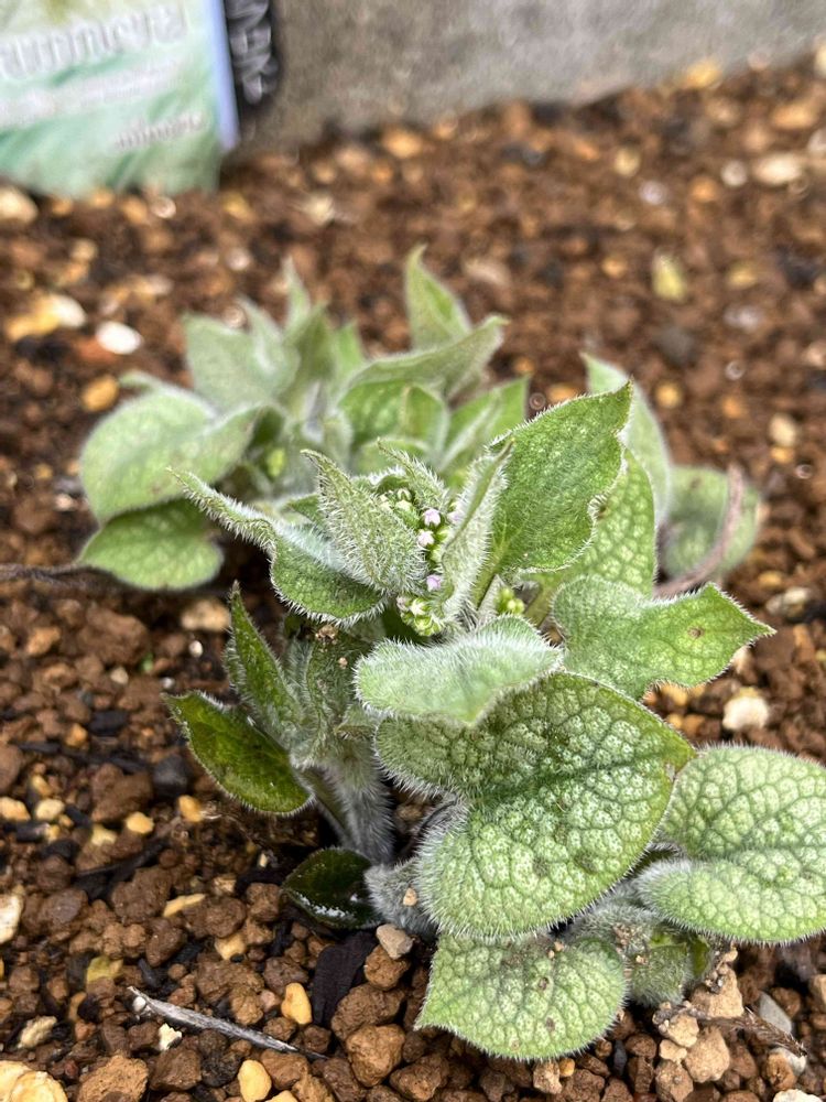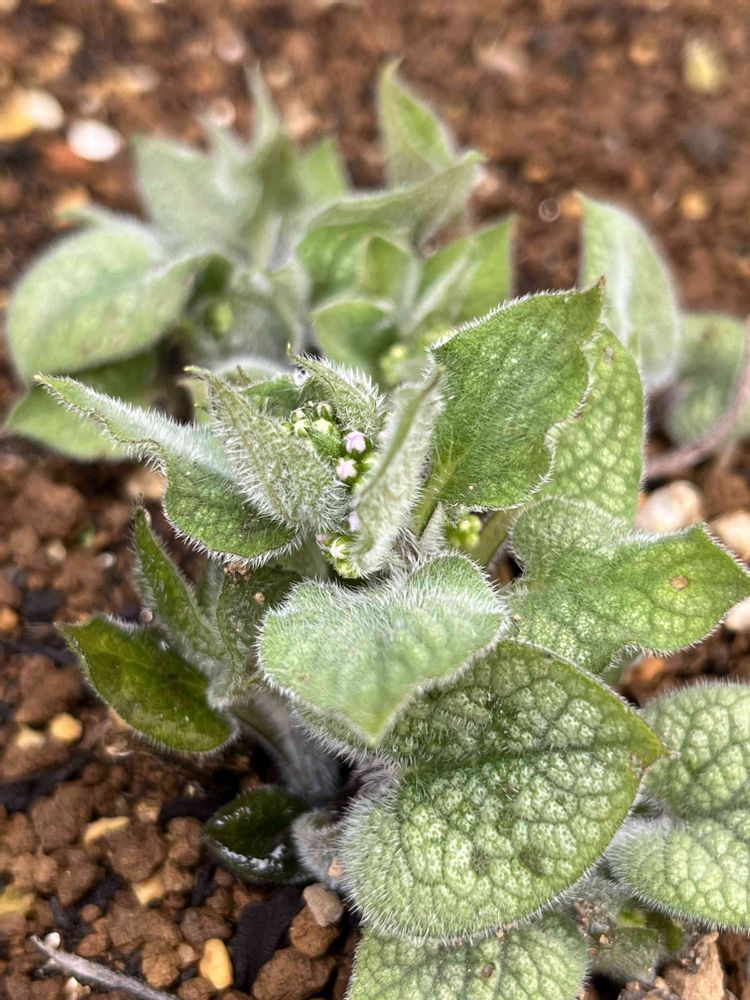 ブルンネラジャックフロスト。冬の間はほぼ日光の当たらない場所です。ここのところの雨で蕾と一緒に新芽が出てきました。ビバーナムスノーボールの下に植えています。