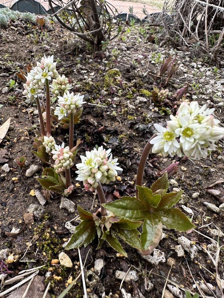 先日投稿のイワヤツデ(丹頂草)の花茎も長く成り開花、ヤツデの様な葉も出て来ました。