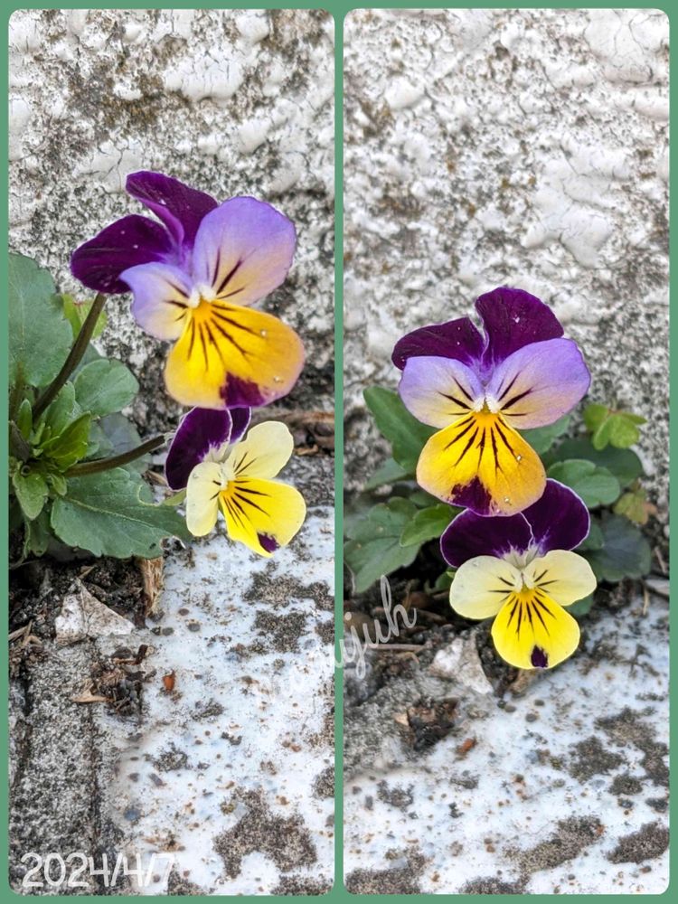 アパート敷地内にて。 敷地ブロック割目から、ビオラが顔を出しています。