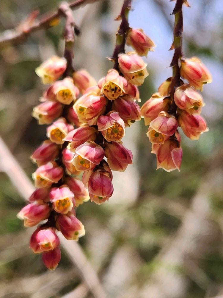 此方の山には1⃣2️⃣のように赤みのあるキブシが普通のキブシに混じって咲いています。グーグルレンズで調べるとアカバナキブシで、園芸種と出ますが他は自然の木ばかりなので、植栽されたとは考え難いです。